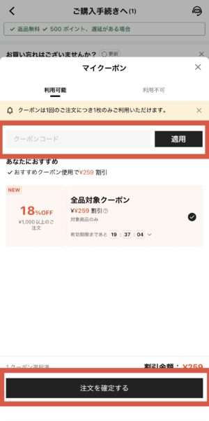 ご注文の確認画面が表示されたら、割引が適用されていることを確認し、問題なければ「注文を確定する」をタップ